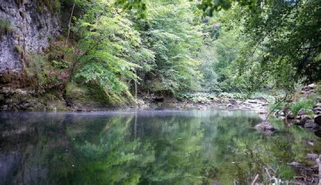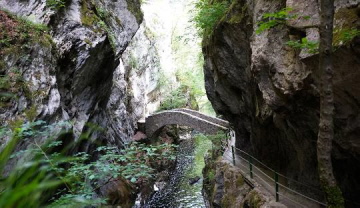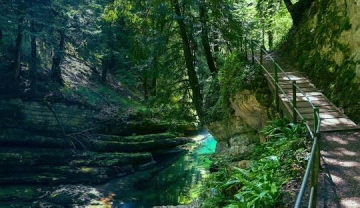 A river like a surprise bag. Just when you think that's it, the Areuse turns up the heat again. Surprises, fascinates and enchants. And it has been doing so for over 100 years. The ‘Sentiers des Gorges de l'Areuse’ association was founded in 1886. Its aim: to maintain the paths, trails, stairs, railings and bridges along the Gorges de l'Areuse. And there are quite a few of them. The course of the sometimes wild, sometimes tame river is crossed 17 times on the hike from Noiraigue to Boudry - from the simple metal footbridge to the modern design bridge to the famous stone arch bridge at Saut de Brot. Sometimes you stroll comfortably along the wide banks of the river, sometimes you gaze anxiously into the depths, where the water is almost invisible. The Areuse is a tributary of Lake Neuchâtel and flows through the Val de Travers. The starting point of the hike is Noiraigue. The path soon descends into the gorge. You pass a hydroelectric power station. It is the first of many. The water power of the Areuse has been utilised since the 14th century. Shortly afterwards, green moss-covered stones glow mystically in the sluggish water. But appearances are deceptive: next comes the Saut de Brot, which was impassable before the hiking trail was built in 1876. It leads over steps and bridges, with the Areuse bubbling deep below in the gorge. After a short stretch through the forest, you reach Champ-du-Moulin-Dessous. The Areuse is now wider and more tamed, and shortly after the Pont de Vert there is a huge overhanging fe.